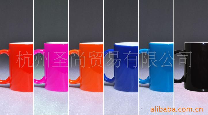 特 点: | 此为全变色涂层杯,变色前为内白外黑(另有红、紫、蓝色),变色后整个杯身外侧变色,图案显示出来。图案同样是热转印上去的,通过加热加压的方式,将油墨升华转印到杯子上形成图案,图案漂亮艳丽,如同照片的效果。 | ||||